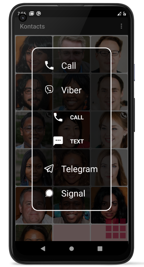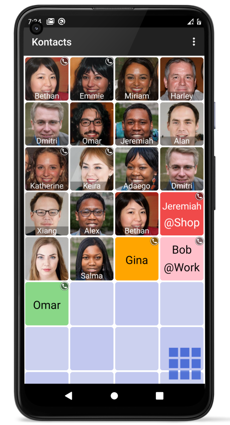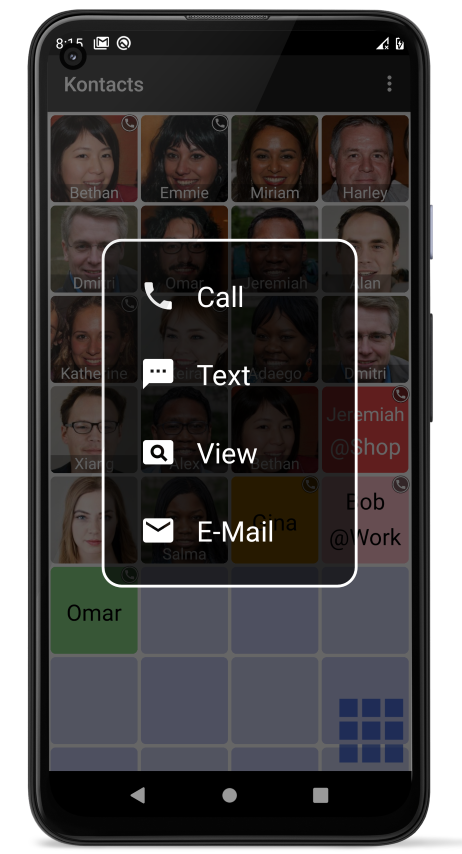 Arrange your contacts onto panels of tiles for quick-dialling, texting (sms), group texting, e-mail etc.